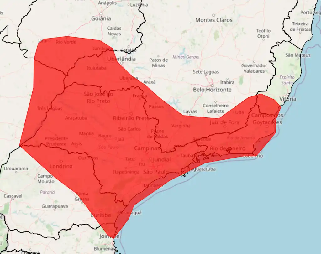 O aviso abrange todos os estados da região Sudeste, além de áreas do norte do Paraná, extremo leste de Santa Catarina, sul de Goiás e leste do Mato Grosso do Sul.
