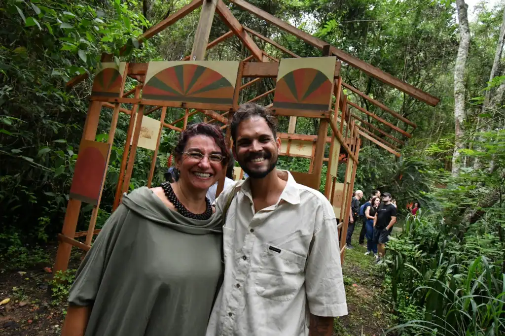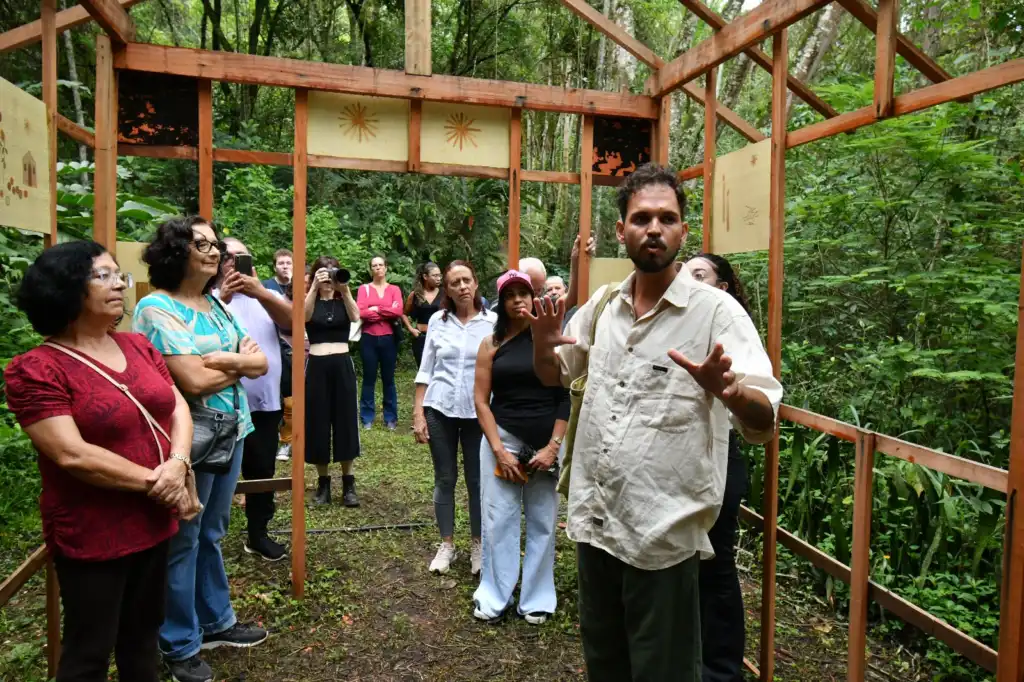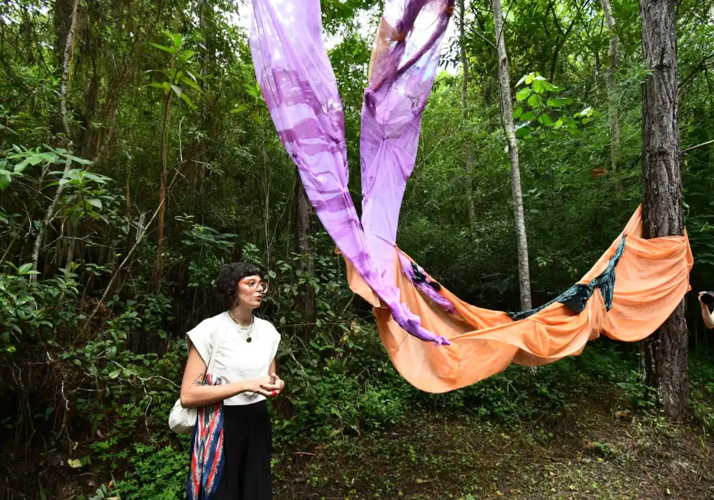 Duda Prado, artista visual, educadora e pesquisadora, assina Presença como Travessia, instalação em tecidos e pigmentos que cria ambientes de silêncio e contemplação, convidando o público à desaceleração e à escuta sensível do corpo e da paisagem.