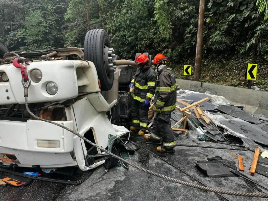 Caminhão carregado de mármore tomba na Tamoios e deixa vítima ferida