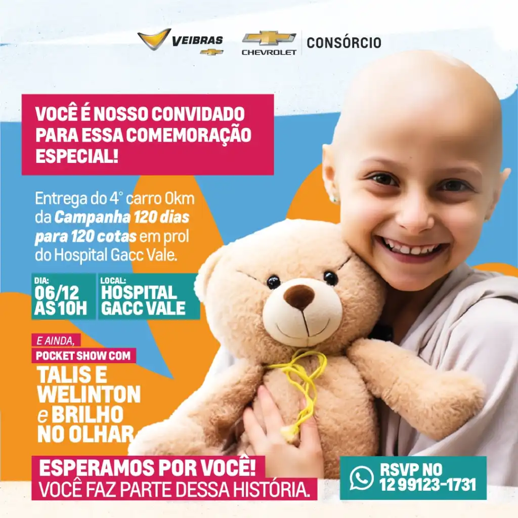 A Veibras Chevrolet realiza no dia 6 de dezembro, a entrega de mais um Chevrolet Onix zero km ao Grupo de Assistência à Criança com Câncer (GACC) em São José dos Campos, como parte da campanha “120 dias para 120 cotas” promovida em parceria com o Consórcio Chevrolet. O evento contará com uma carreata e pocketshow da dupla Talis e Welinton e do grupo Brilho no Olhar.