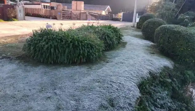 A geada cobriu parte da vegetação e veículos estacionados ao ar livre durante a madrugada. O fenômeno ocorre quando há formação de uma fina camada de gelo sobre as superfícies, resultado da queda acentuada de temperatura associada à alta umidade.