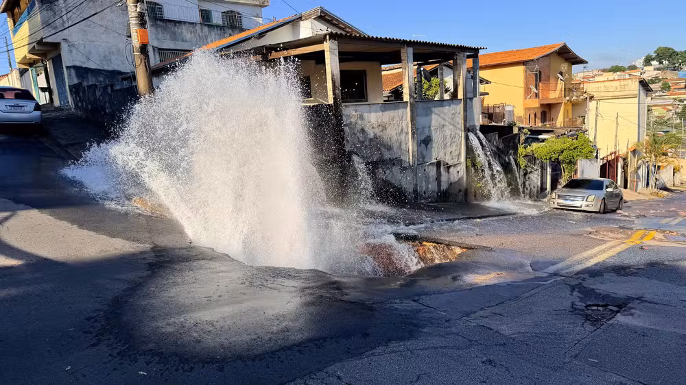 Imagens gravadas por moradores mostram a água jorrando a mais de um metro de altura. O vazamento foi controlado por volta das 8h da manhã.