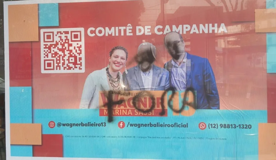 Além de pintarem os rostos do candidato a prefeito Wagner Baleiro (PT) e do presidente da República Lula (PT), uma mensagem de “Fora!” foi escrita pelos pichadores.