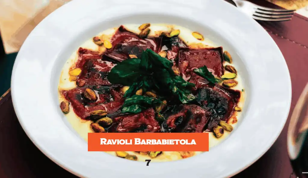 O Ravioli Barbabietola é uma massa artesanal preparada com beterraba fresca, ovos caipiras e sêmola de trigo italiano, que confere cor intensa e sabor delicadamente adocicado. O recheio une a cremosidade da muçarela de búfala à crocância do pistache e ao toque sutil do mel, criando uma combinação equilibrada entre salgado e doce. Para finalizar, o prato é servido com um aveludado molho de gorgonzola, pistaches tostados e um fio de mel exótico.