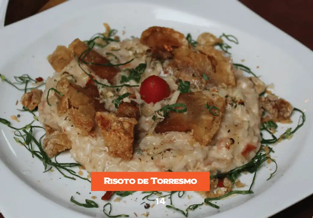 O Risoto de Torresmo é um clássico de parmesão, com lascas de pancetta crocante, farofa de torresmo seco e parmesão gratinado.