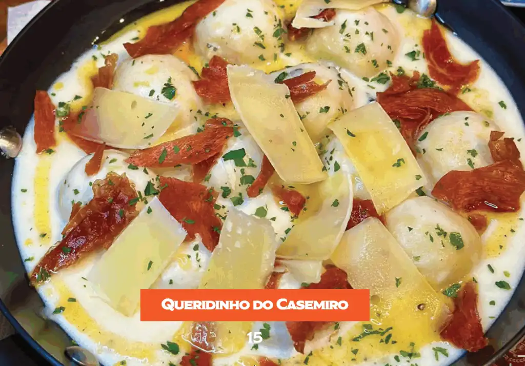 O Queridinho do Casemiro é um nhoque recheado com gorgonzola, com molho bechamel, crispy de presunto cru e lascas de grana padano.