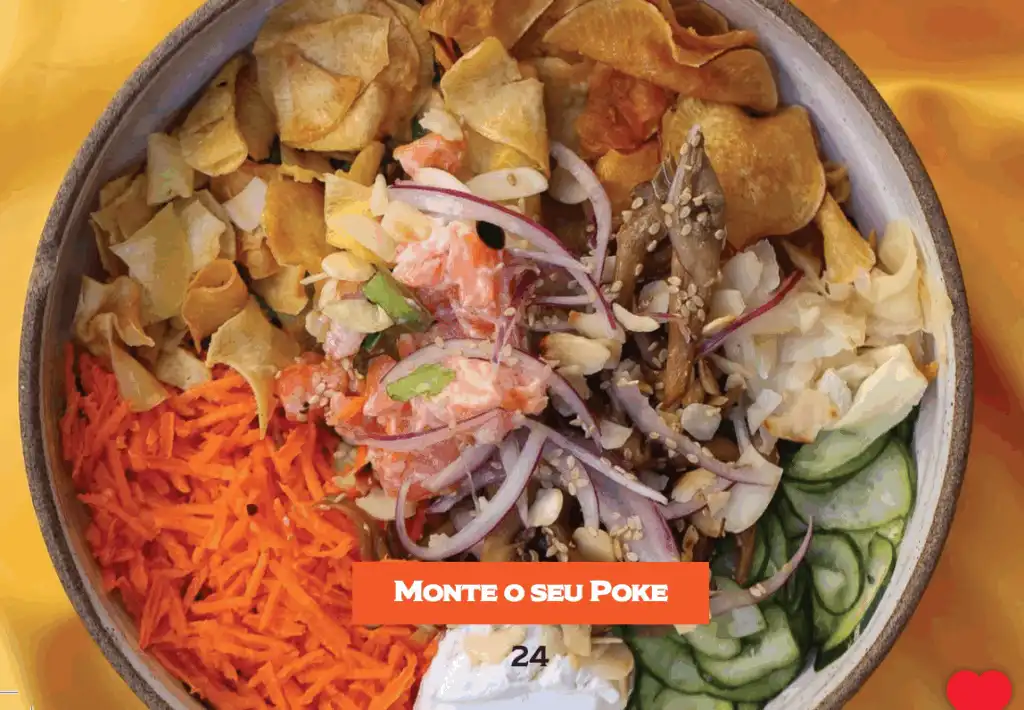 O cliente escolhe até 2 bases, 2 proteínas, 1 molho, 3 toppings, 2 crunches e 1 finalização para montar o seu poke ideal. Ingredientes frescos, combinações criativas e muito sabor.