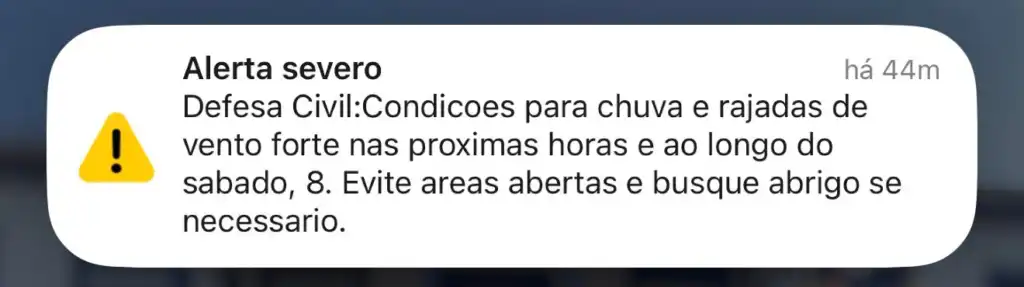 De acordo com a mensagem oficial enviada pelo órgão, há risco de instabilidades intensas que podem provocar transtornos em diferentes regiões da cidade e da região. O aviso destaca que a população deve evitar áreas abertas e buscar abrigo sempre que necessário, especialmente durante a ocorrência de rajadas fortes.