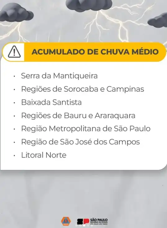 As condições meteorológicas podem provocar alagamentos, deslizamentos de terra e queda de árvores, principalmente nas áreas de relevo acidentado e de maior densidade urbana. O acumulado médio de chuvas vale para as regiões da Serra da Mantiqueira, Sorocaba e Campinas, Baixada Santista, Bauru e Araraquara, Região Metropolitana de São Paulo, São José dos Campos e Litoral Norte.