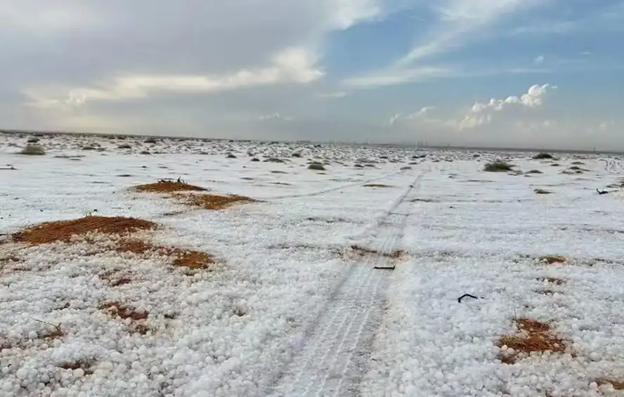 A previsão para os dias seguintes era de formação de tempestades, ventos fortes e chuvas torrenciais. Imagens que viralizaram nas redes sociais mostram o deserto de Al-Nafud, na região de Al-Jawf, na Arábia Saudita, coberto com o que parece ser neve. A camada de gelo, na verdade, foi formada por granizo, mas as imagens ainda chamam a atenção pelo cenário atípico.