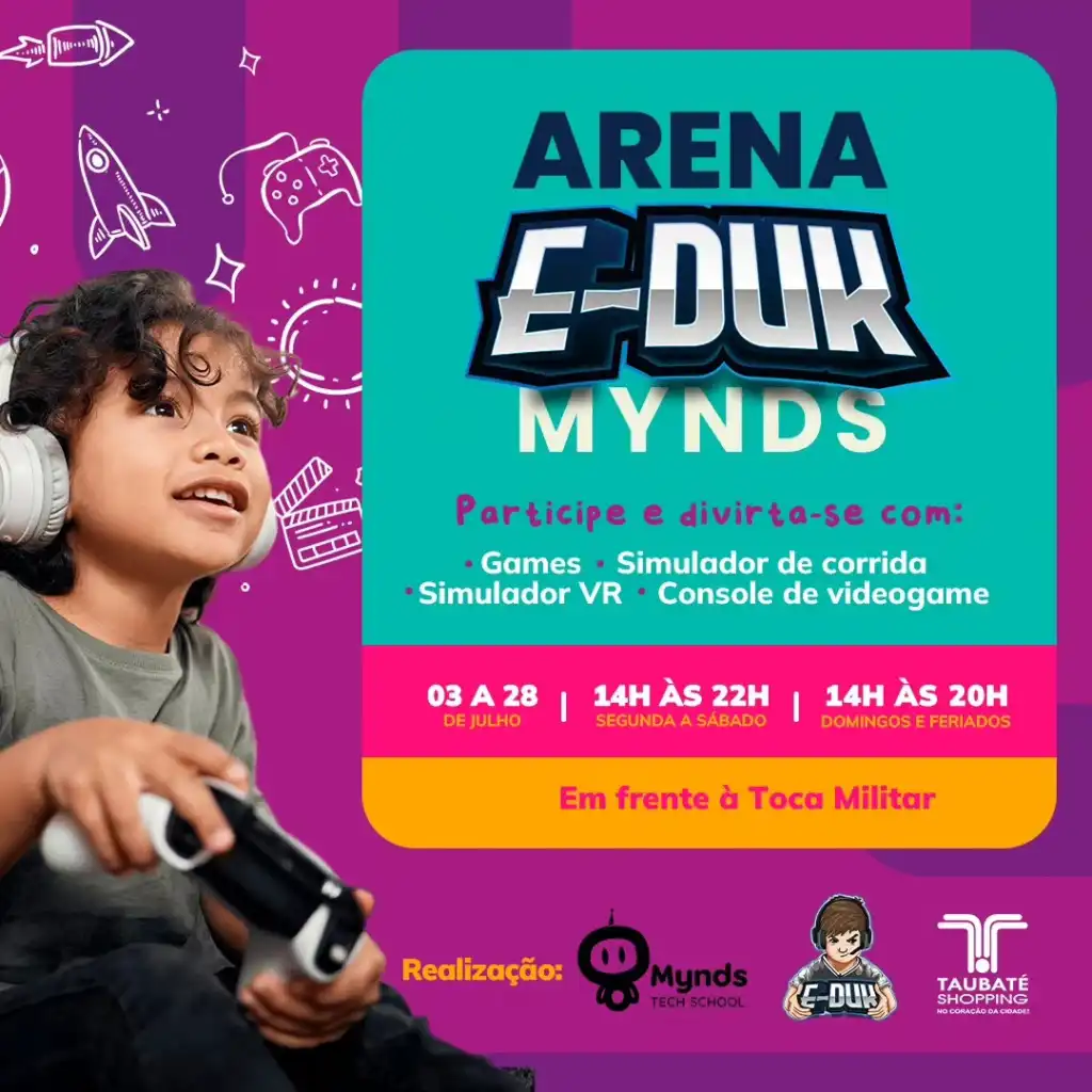 A Arena Eduk-Mynds já está disponível para o público, um projeto social da Associação Valeparaibana de E-sports, que estará durante todo o mês com uma arena gamer. O espaço oferece uma imersão nesse universo e conta com computadores, simulador de corrida e console de videogame. A ação acontece em frente à loja Toca Militar e está aberta de segunda a sábado, das 14h às 22h; e aos domingos e feriados, das 14h às 20h.