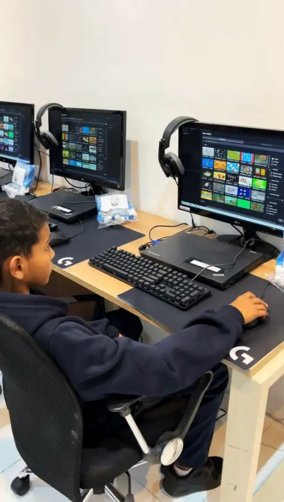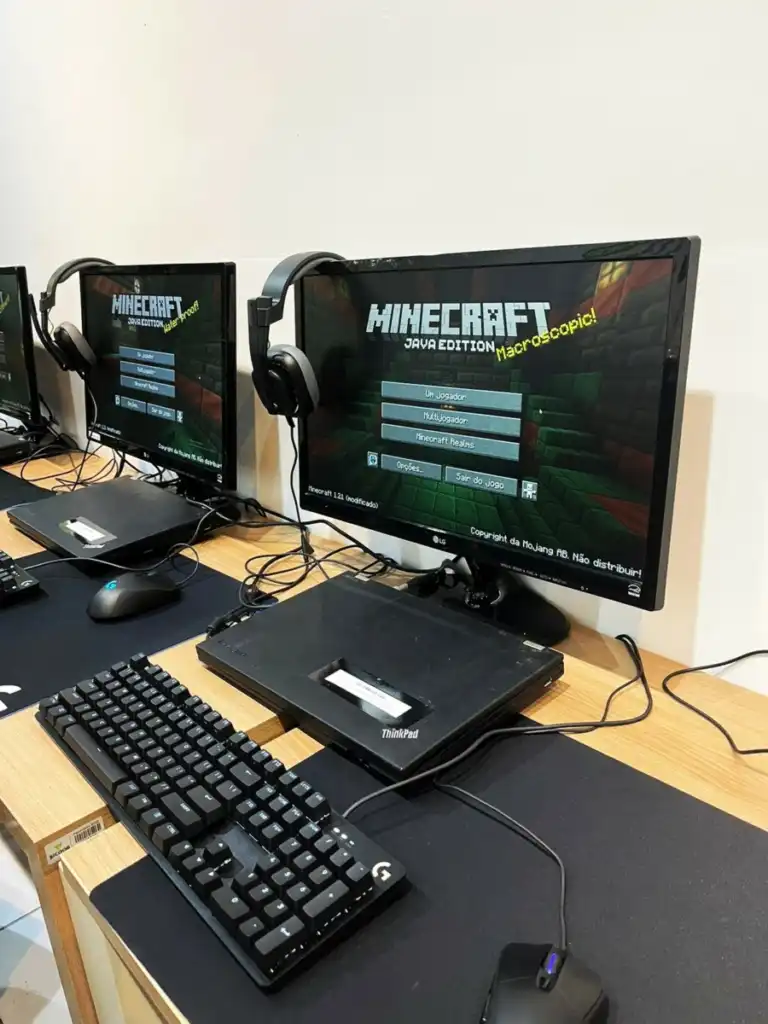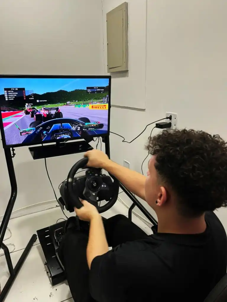 Arena gamer com computadores, simulador de corrida, simulador VR e console de videogame