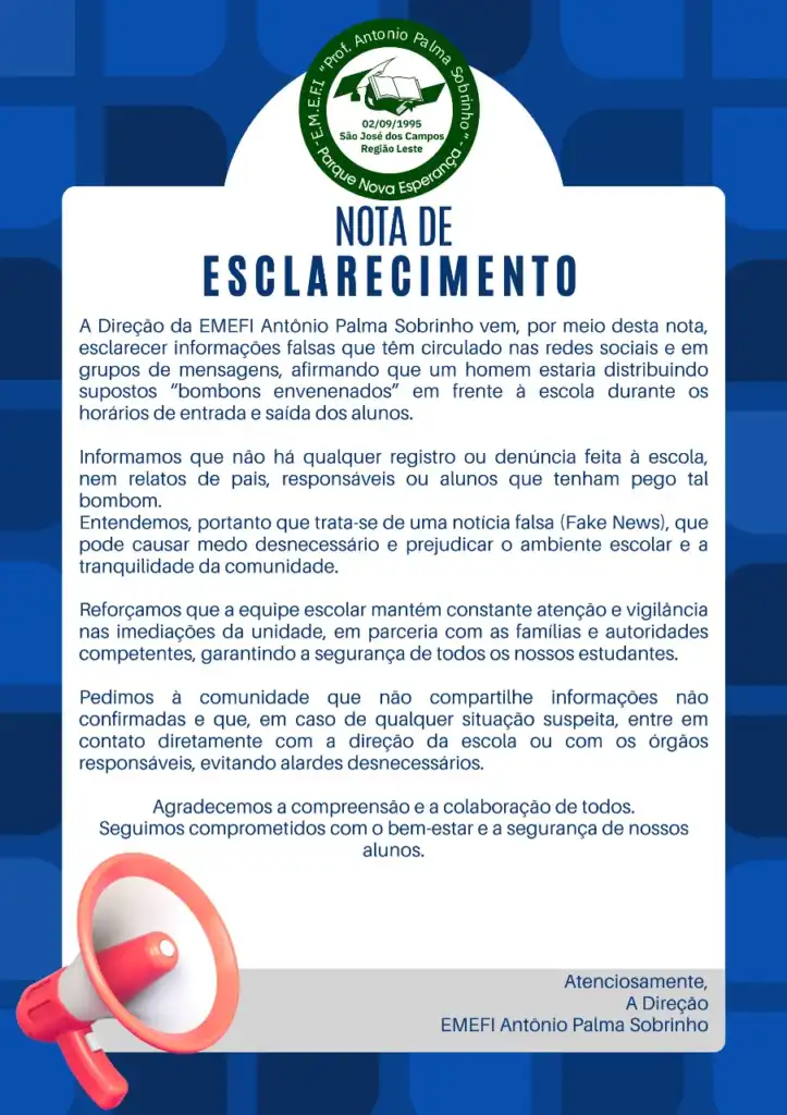 A direção da EMEFI Antônio Palma Sobrinho, localizada no Parque Nova Esperança, em São José dos Campos, divulgou uma nota de esclarecimento nesta quarta-feira (22) para desmentir informações falsas que circulam nas redes sociais e em grupos de mensagens. Os boatos afirmavam que um homem estaria distribuindo “bombons envenenados” em frente à unidade escolar durante os horários de entrada e saída dos alunos.