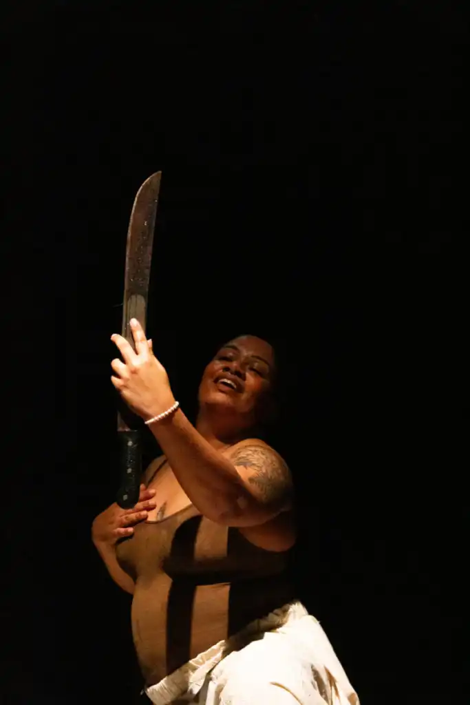 “Durante o processo de criação do espetáculo, o objeto espada apareceu em diversos momentos, provavelmente porque muitos Orixás usam espada.”, conta Ana Clara Ferraz. “Esse elemento possui uma diversidade de símbolos e significados profundos em muitas culturas. A espada é frequentemente associada à coragem, à força, à proteção e ao poder. Ela pode representar a habilidade de enfrentar desafios, superar obstáculos e defender-se. Por outro lado, o espelho costuma ser associado à reflexão, à autoconsciência e à busca por um EU interior.