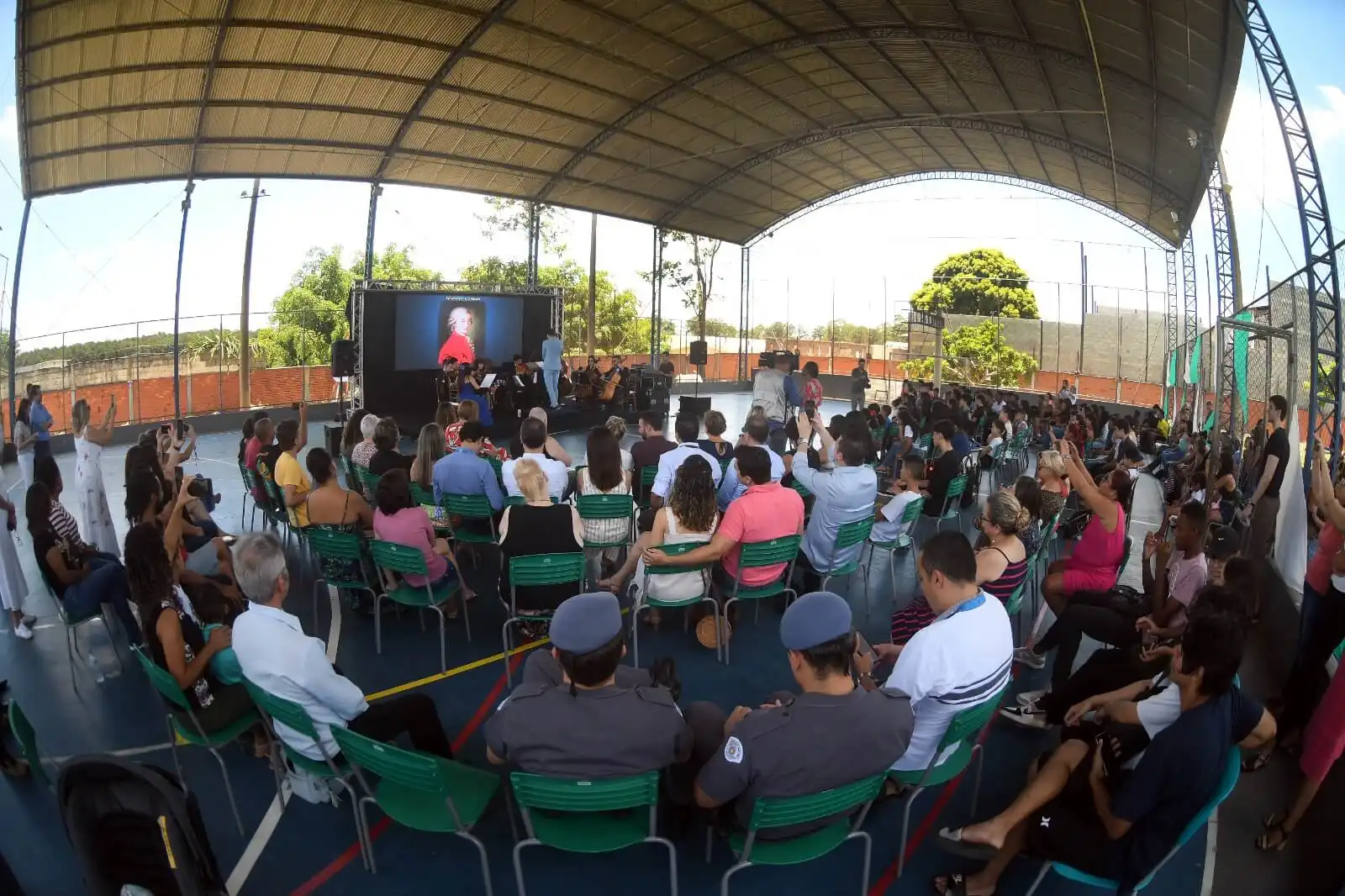 Todos foram convidados a tomar seus lugares na quadra coberta da escola para o grande momento. No palco, a Orquestra Filarmônica do Vale sob o comando do Maestro Paulo D´Angeles Secio, se posicionou para iniciar o espetáculo. Muitos nunca haviam visto uma orquestra, e as primeiras reações aparecem depressa, com alguns encantados, outros não escondendo o entusiasmo e filmando o momento com os celulares. A emoção tomou conta, pois música boa é assim, contagia.
