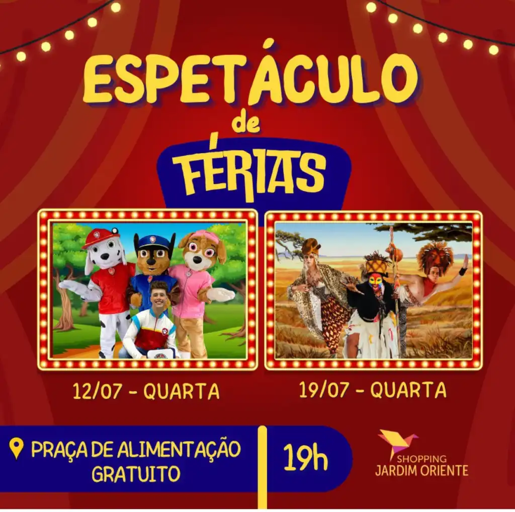 Férias divertidas com peça teatral gratuita para a garotada no Shopping Jardim Oriente, em São José dos Campos. Serão dois espetáculos incríveis, e a estreia é nesta quarta – feira, dia 12 de julho, às 19h, na Praça de Alimentação. O estacionamento é gratuito.