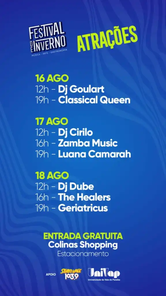 O Festival de Inverno ‘Música, Arte e Gastronomia’, evento que reúne artistas do cenário regional e nacional, será realizado no estacionamento do Colinas Shopping em São José dos Campos de 16 a 18 de agosto. O festival é gratuito e aberto para toda a família, com um espaço kids especialmente dedicado às crianças.