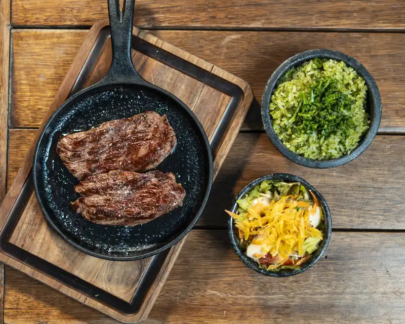 Irresistivelmente delicioso, o Ribeye é o “olho” da costela bovina formado por duas carnes separadas por uma camada de gordura. Por ter alta concentração de marmoreio, que é a gordura entremeada nas fibras, é um corte extremamente macio e muito suculento. Tanto a opção bovina quanto o frango são grelhados na parrilla da casa.
