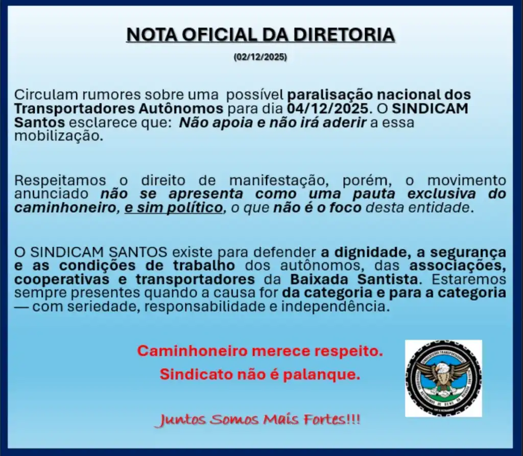 Por outro lado, de acordo com nota oficial do Sindicato dos Transportadores Rodoviários Autônomos de Bens da Baixada Santista e Vale do Ribeira (SINDICAM), uma das entidades com maior representação na categoria, o sindicato não apoia e não vai aderir à mobilização porque, segundo a nota, a ação “não se apresenta como uma pauta exclusiva do caminhoneiro, e sim política”.