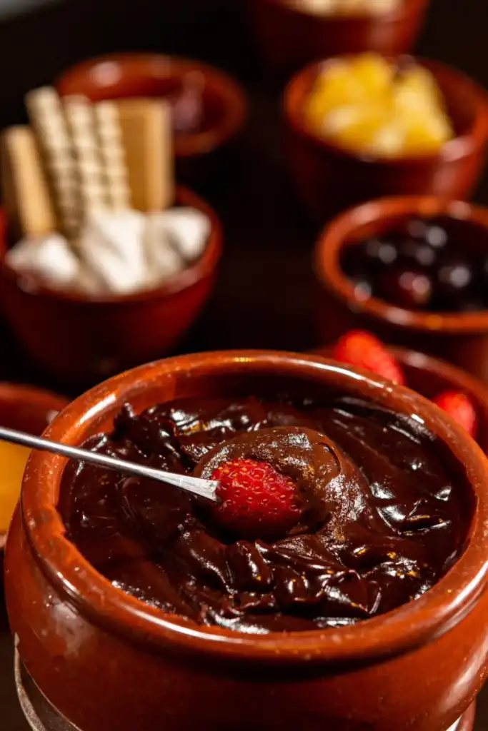 Fondue de Chocolate, também servindo duas pessoas, acompanhado por morango, banana, uva, laranja, doce de leite, goiabada, waffles, marshmallow e bijú. (R$89).