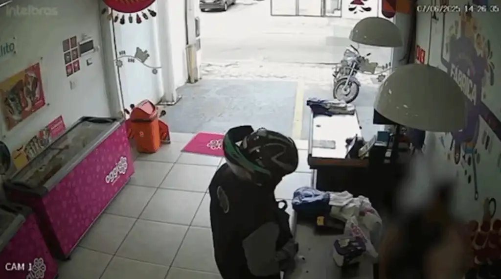 Imagens da câmera de segurança mostram que o assaltante fingiu ser um cliente e escolheu um pote de sorvete para comprar. Ao chegar no caixa para o pagamento, ele anunciou o assalto e obrigou a funcionária a entregar o dinheiro.