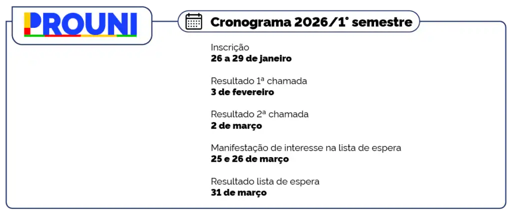 Para participar da lista de espera do Prouni, o candidato deverá manifestar seu interesse por meio do Portal Acesso Único nos dias 25 e 26 de março de 2026. A lista estará disponível na página do Prouni, também no Portal Acesso Único, no dia 31 de março, para consulta pelas instituições de ensino superior e pelos candidatos.