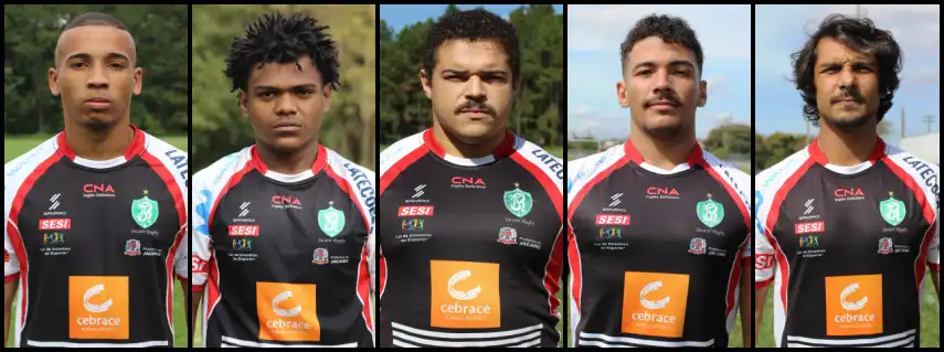 Foto: Andrei Santana, Kaiky Araújo, Levy Marinho, Maiki Lemes e Matheus Cruz (da esquerda para a direita) foram convocados para os Tupis XV - Fotos Ícaro Leal/Jacareí Rugby