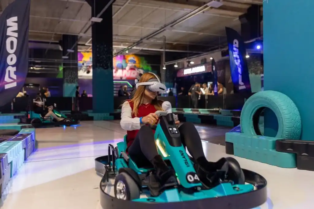 Voltado para o público de todas as idades, o VROOM propõe uma experiência inédita e divertida ao combinar karts reais com óculos de realidade virtual, que projetam cenários digitais interativos ao redor de uma pista física.