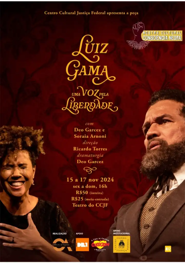 O espetáculo, há quase uma década em cartaz, destaca os escritos de Gama, suas defesas jurídicas em favor de pessoas escravizadas e seus poemas satíricos. A narrativa também faz paralelos entre o período escravocrata do Brasil Imperial e o Brasil de hoje, enfatizando que a Abolição ainda não foi completamente alcançada. A interpretação dos atores combina tons dramáticos com humor e sátira, buscando provocar reflexão sobre a exclusão social, em especial sobre o racismo estrutural na nossa sociedade e se constitui um importante instrumento de luta antirracista, lembrando-nos de que ela permanece urgente e necessária. O evento, que integra a Mostra Cultural Consciência Negra do CCJF, será realizado em curtíssima temporada, nos dias 15, 16 e 17 de novembro, às 16h, no teatro do CCJF.