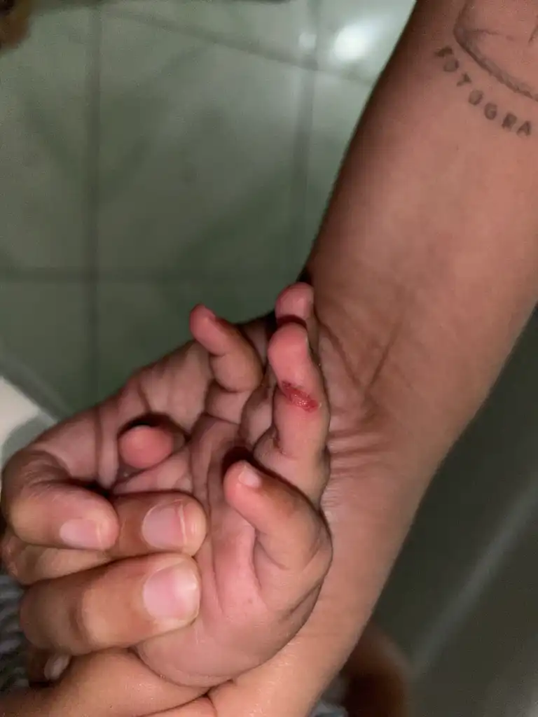 Segundo ela, ao tentar segurar a mão do bebê, notou que ele reagiu de forma incomum, retirando rapidamente a mãozinha. Ao observar melhor, encontrou um machucado entre os dedos da criança.
