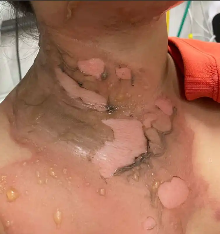 A criança teve queimaduras de segundo e terceiro grau; a água quente atingiu o pescoço e o tórax da aluna
