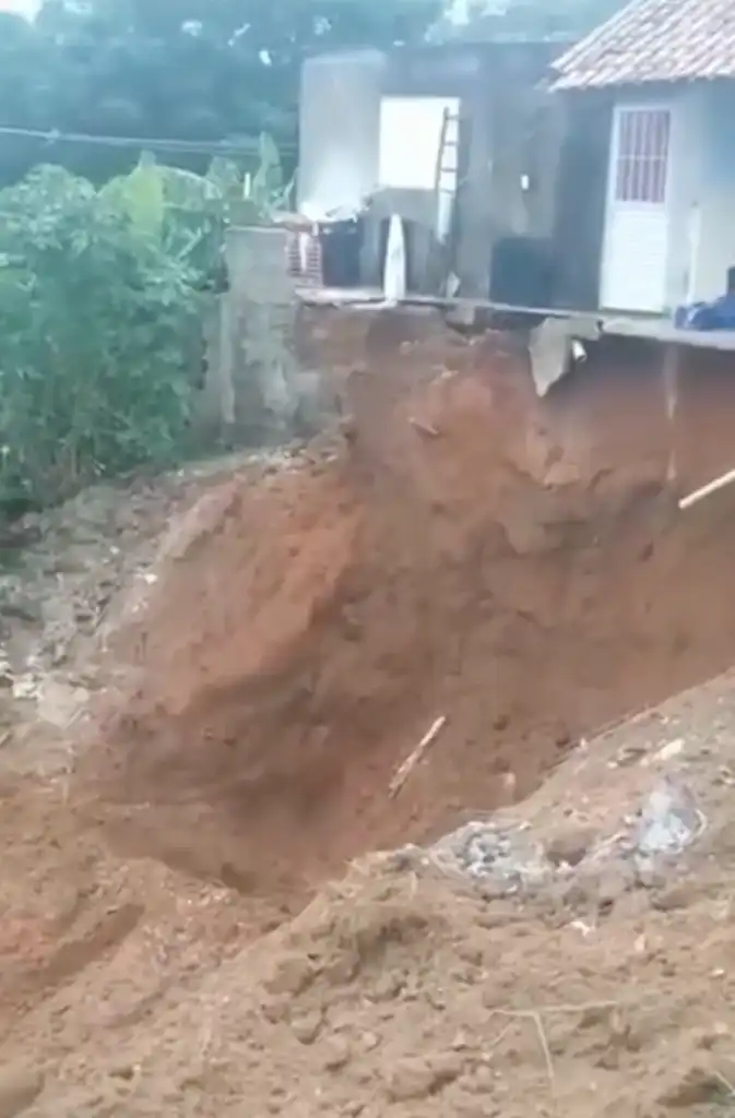 No vídeo é possível ver uma moradia na beira de um barranco e a pessoa que narra a situação conta que a casa foi interditada pela Defesa Civil municipal. Ela também diz que uma assistente social esteve no local e que os pertences dos moradores estão na casa de um vizinho.