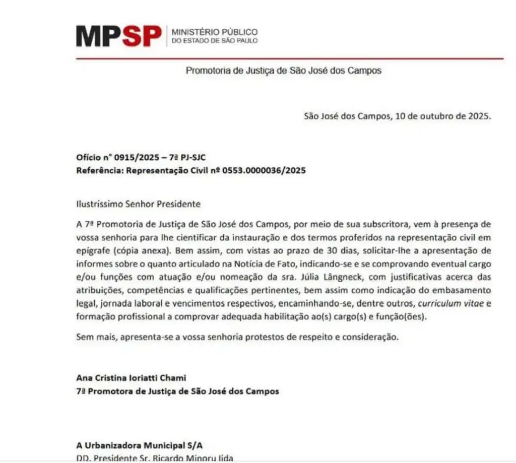 De acordo com documento que o Aqui Vale teve acesso, o Ministério Público de SP instaurou uma Representação Civil e oficializou à Urbam um pedido de informações profissionais sobre Júlia Lângneck (cargo, salário, carga horária, função, competência, qualificação para o cargo etc).