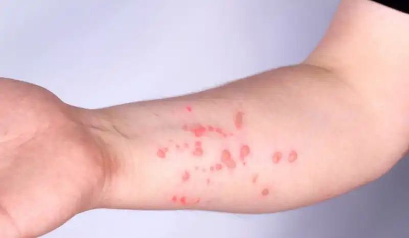 A sintomatologia é diversa, com presença de febre, aumento dos gânglios linfáticos, dores pelo corpo, mas o que define a suspeita são as lesões de pele, chamadas vesículas, similares às lesões causadas pelo herpes ou catapora, frequentemente com uma depressão central (“umbilicalicação central). Essas lesões podem estar presentes no local de inoculação, ou seja, nos casos de infecção por via sexual em genitália ou região anal, e ou em outras partes do corpo.