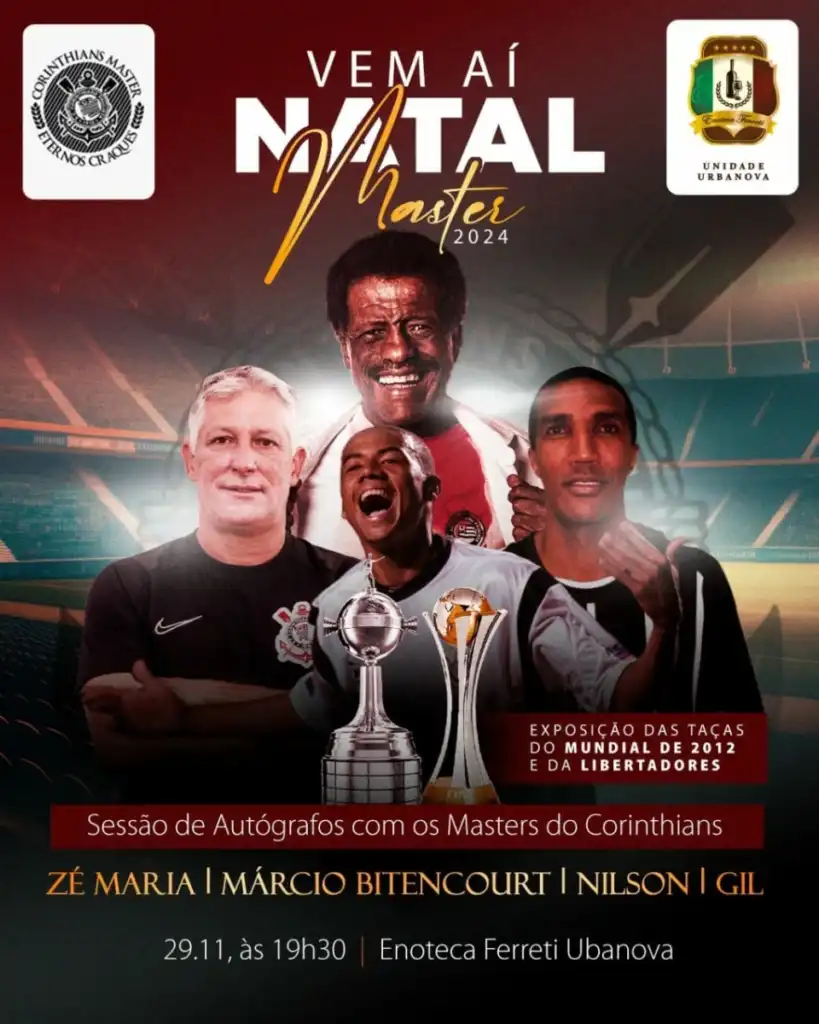 A Enoteca Ferreti realizará nesta sexta-feira (29) uma noite de autógrafos com os grandes craques do Corinthians: Zé Maria, Márcio Bitencourt, Nilson, Gil e Junior Ferreti. O evento gratuito nomeado como ‘Natal Masters 2024’, será realizado a partir das 19h30, no Madrid Open Mall, e contará com uma exposição das taças do mundial de 2012 e libertadores.