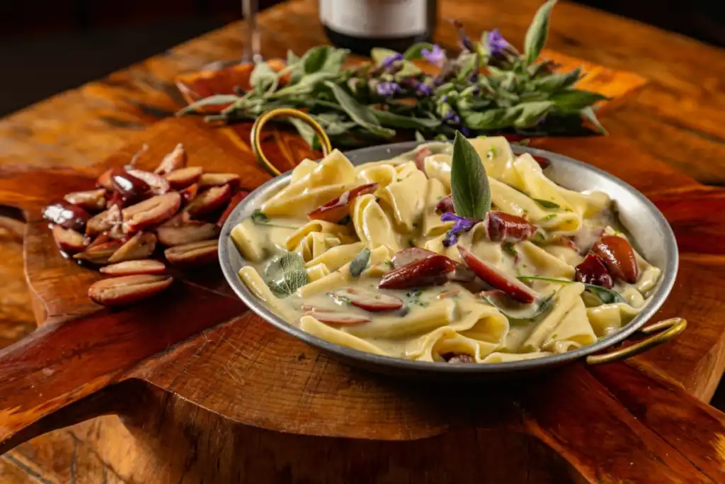 Principal – Papardelle com pinhões, sálvia e molho branco; ou Medalhão ao molho de vinho tinto, acompanha Risotto de queijo; ou Truta salmonada com molho de espumante, creme de leite fresco e ervas frescas, acompanha Risotto de açafrão;
