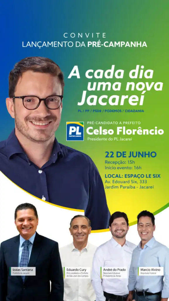 O Partido Liberal (PL) de Jacareí irá lançar a pré-candidatura de Celso Florêncio a prefeito da cidade, no sábado (22). O evento, que é aberto ao público, será realizado no Espaço Le Six, às 15h, na rua Edouard Six, 333, no Jardim Paraíba.