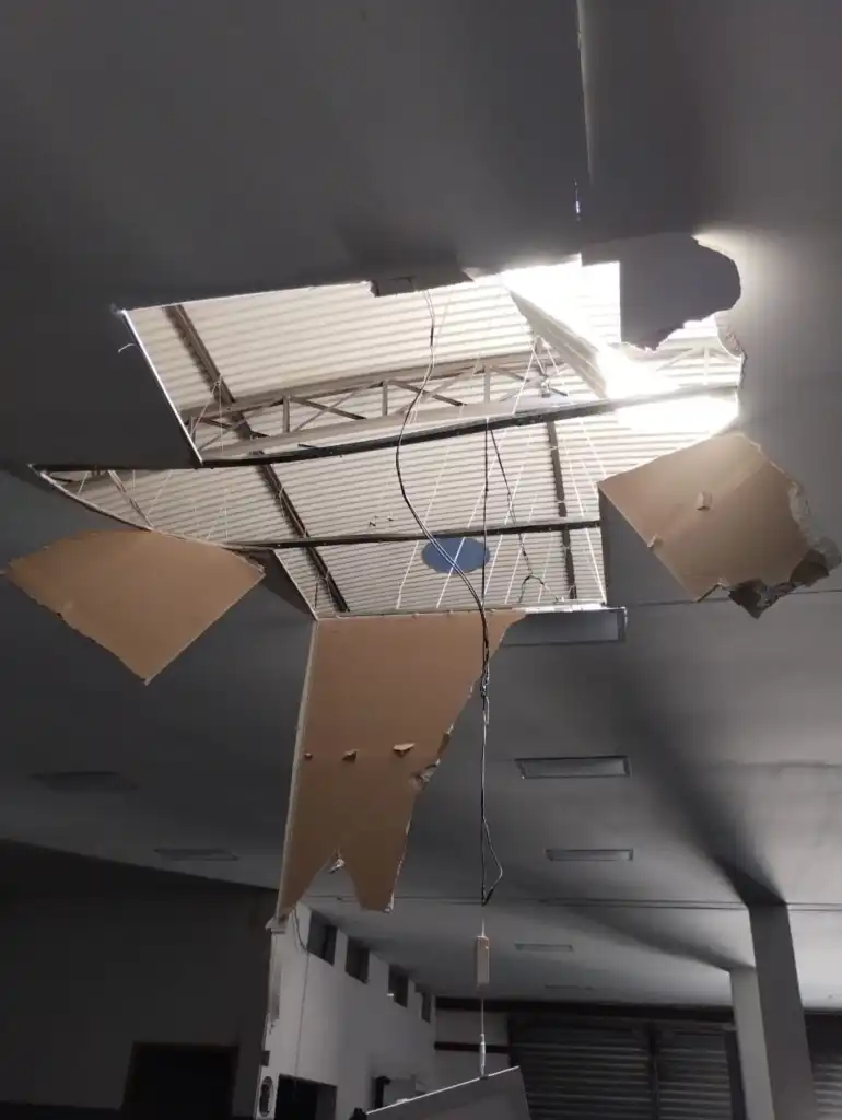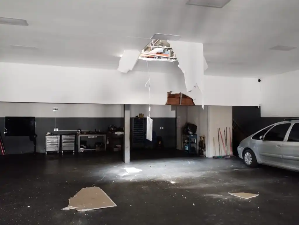 Durante a queda, o telhado do imóvel cedeu e rompeu o forro de gesso, o que acabou reduzindo o impacto. Com isso, o homem sofreu apenas escoriações leves.