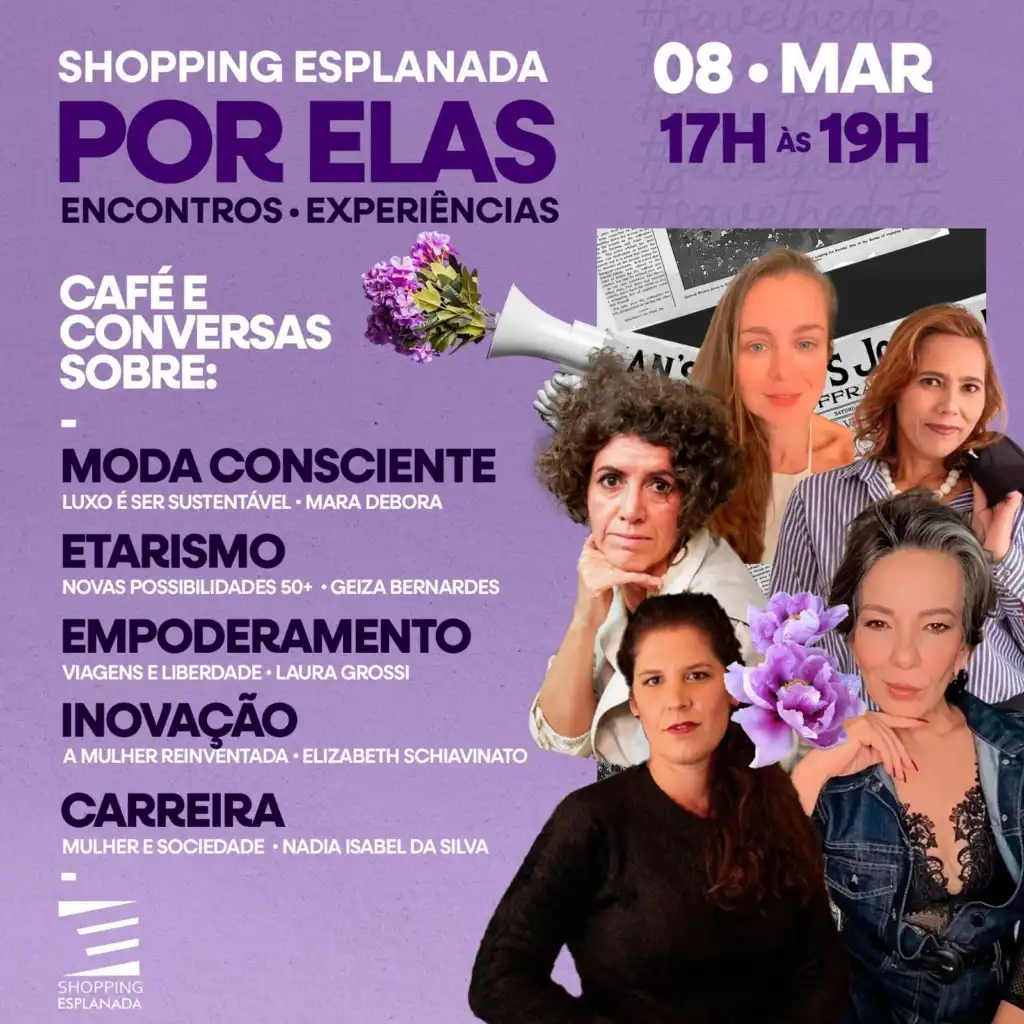 O Shopping Esplanada promove no dia 8 de março das 17h às 19h, uma série de conversas sobre o Dia Internacional da Mulher trazendo os temas mais inovadores e relevantes para o momento em um café da tarde.
