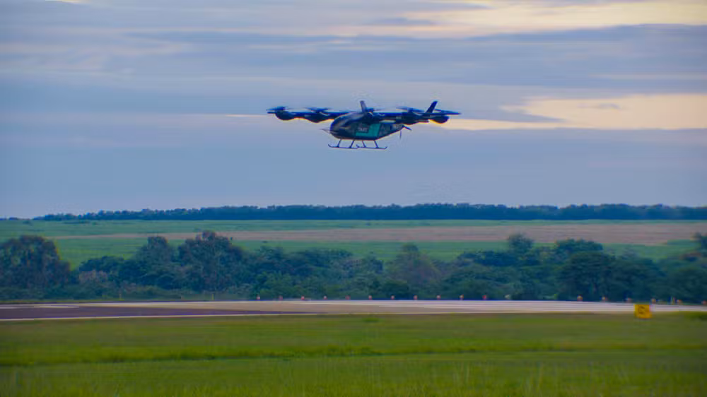 Popularmente chamados de carros voadores, os eVTOLs (veículos elétricos de pouso e decolagem vertical) são produzidos em Taubaté (SP), em uma planta com capacidade para fabricar até 480 unidades por ano. Os veículos continuam em fase de testes e devem entrar em operação em 2027.