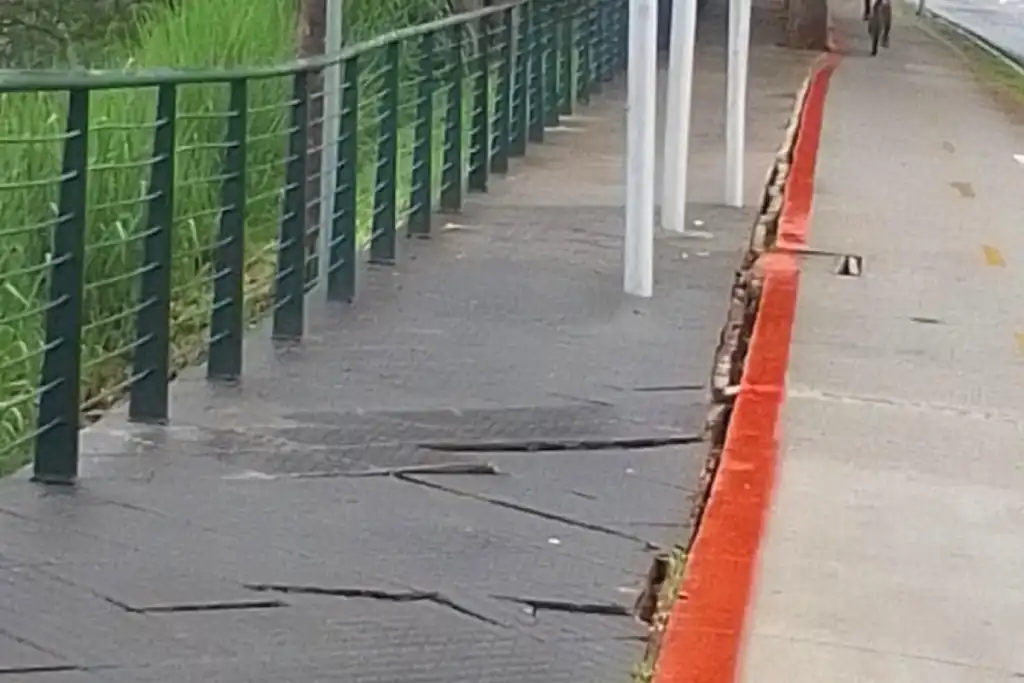 Uma imagem registrada no local mostra rachaduras no piso da calçada e desníveis ao longo do trajeto, o que tem causado insegurança a pedestres e ciclistas que utilizam a via diariamente.