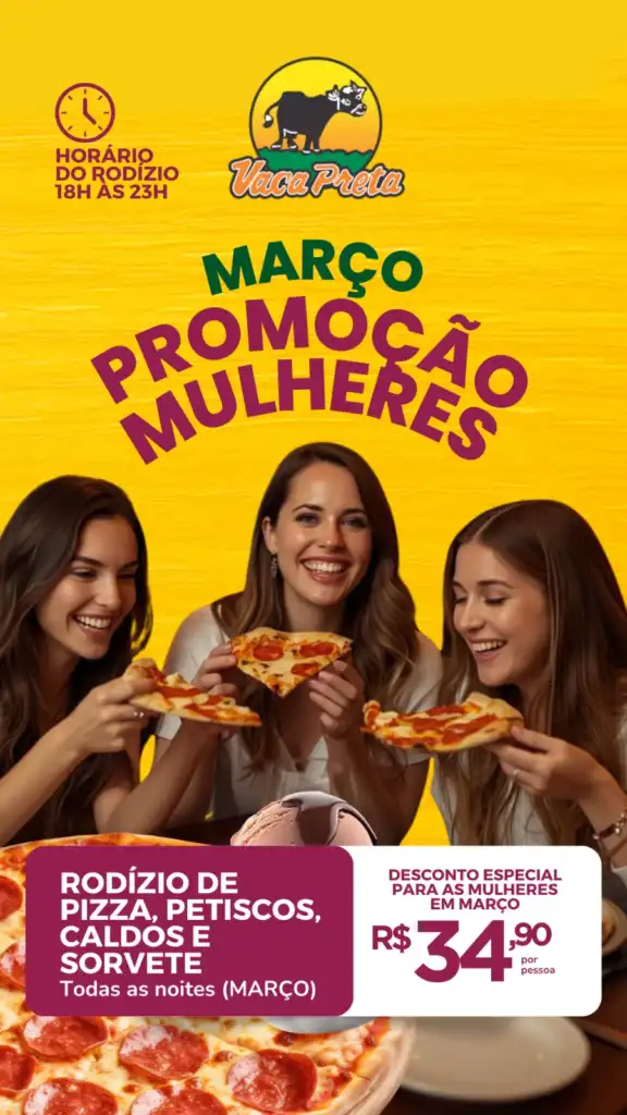 Rodízio completíssimo de pizza, petiscos, caldos e sorvete por apenas R$ 34,90 (por pessoa) para todas as mulheres!