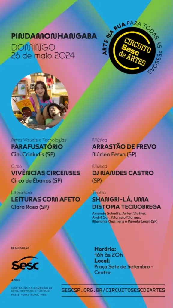 . Esse é o propósito do Circuito Sesc de Artes 2024, que traz uma extensa programação cultural a todo o estado de São Paulo. Neste fim de semana, o Sesc Taubaté leva o Circuito a Pindamonhangaba, no domingo (26), a partir das 16h. O público poderá curtir uma programação variada, com música, teatro, literatura, circo, artes visuais e tecnologias na Praça 7 de Setembro (o local foi alterado devido às chuvas previstas para este domingo).