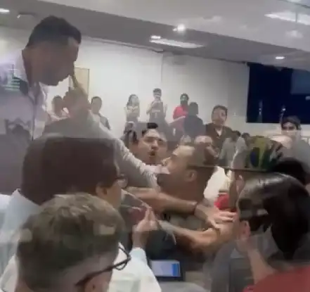 O vereador Moises Pirulito (PL) aparece em cima de uma cadeira, discutindo com servidores. Um dos funcionários encosta o dedo no rosto do vereador e ele revida