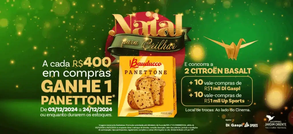 Para deixar as festividades de final de ano ainda mais incríveis, o Shopping Jardim Oriente, em São José dos Campos, promove um delicioso incentivo para toda família que vai até ao shopping fazer suas compras, para isso preparou a 2ª fase da Campanha Natal para Brilhar, que é o Compre e Ganhe, que irá presentear o cliente com um panettone Bauducco, de 03/12 a 24/12 ou enquanto durar os estoques. É válido um panettone por cpf. O balcão para retirada do brinde está ao lado do cinema. Além disso, o cliente também garante um número da sorte para concorrer ao novo Citroen Basalt Feel 1.0 e a 10 vale-compras de R$1.000,00 na loja Di Gaspi e 10 vale-compras de R$1.000,00 na loja Up Sports.