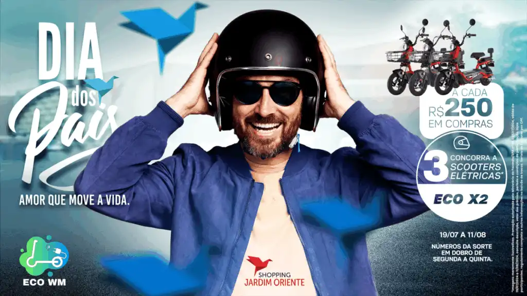 A Campanha do Dia dos Pais do Shopping Jardim Oriente de São José dos Campos “Amor Que Move A Vida” será realizada de 19 de julho a 11 de agosto. O presentão deste ano, será o sorteio de uma scooter elétrica modelo ECO WM ECO X2 para três clientes. A promoção conta com a parceria da empresa ECO WM KUYAN.