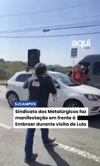 Durante a visita do presidente Lula (PT) a São José dos Campos nesta sexta-feira (19), o Sindicato dos Metalúrgicos foi até a frente da Embraer realizar uma manifestação.