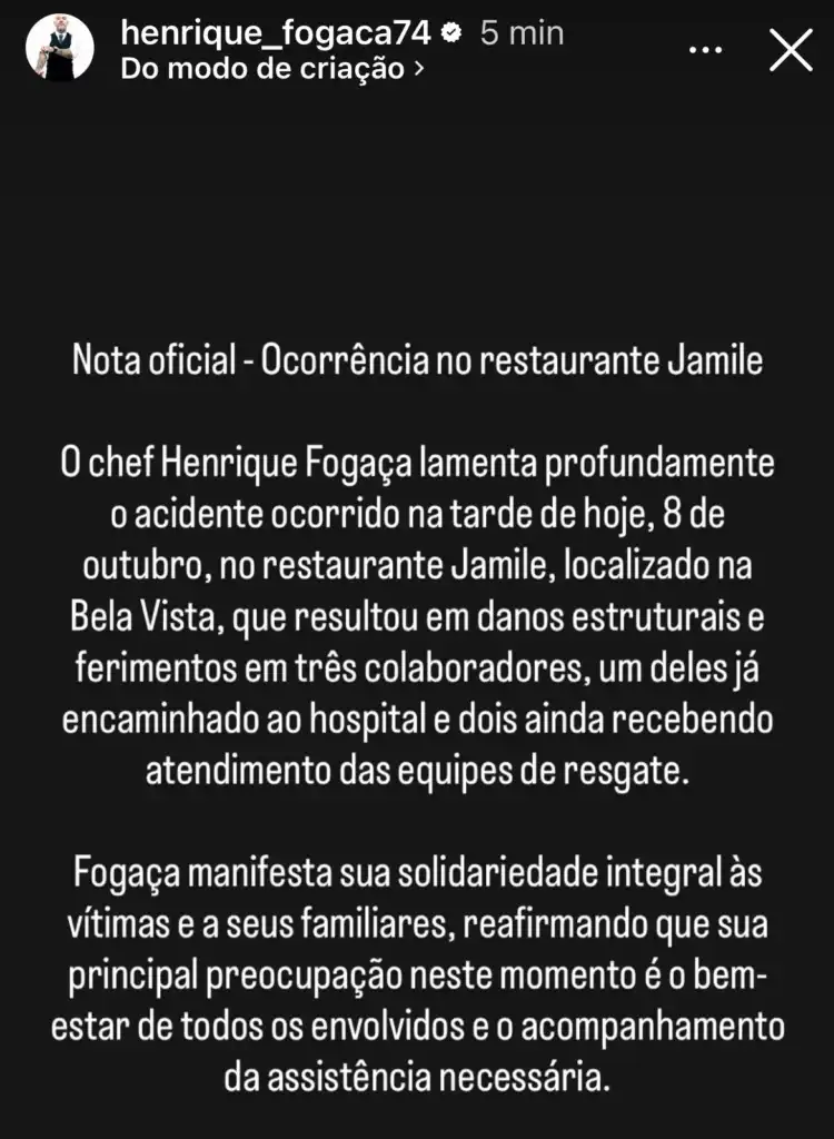 Em nota oficial, Henrique Fogaça lamentou profundamente o acidente e manifestou solidariedade às vítimas. “Minha principal preocupação neste momento é o bem-estar de todos os envolvidos e o acompanhamento da assistência necessária”, afirmou o chef.