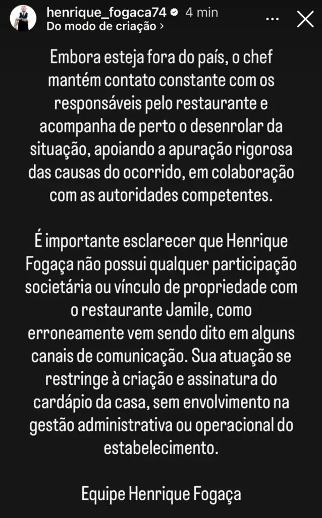 Fogaça, que está fora do país, disse ainda que não possui participação societária ou vínculo de propriedade com o restaurante Jamile, esclarecendo que “sua atuação se restringe à criação e assinatura do cardápio da casa, sem envolvimento na gestão administrativa ou operacional do estabelecimento”.