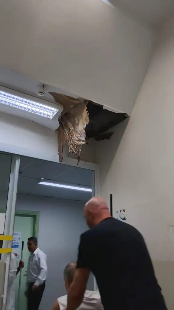 Pouco depois, parte da estrutura cedeu e caiu no chão, deixando placas de forro espalhadas e uma abertura no teto, próxima às luminárias e à porta de acesso ao setor.